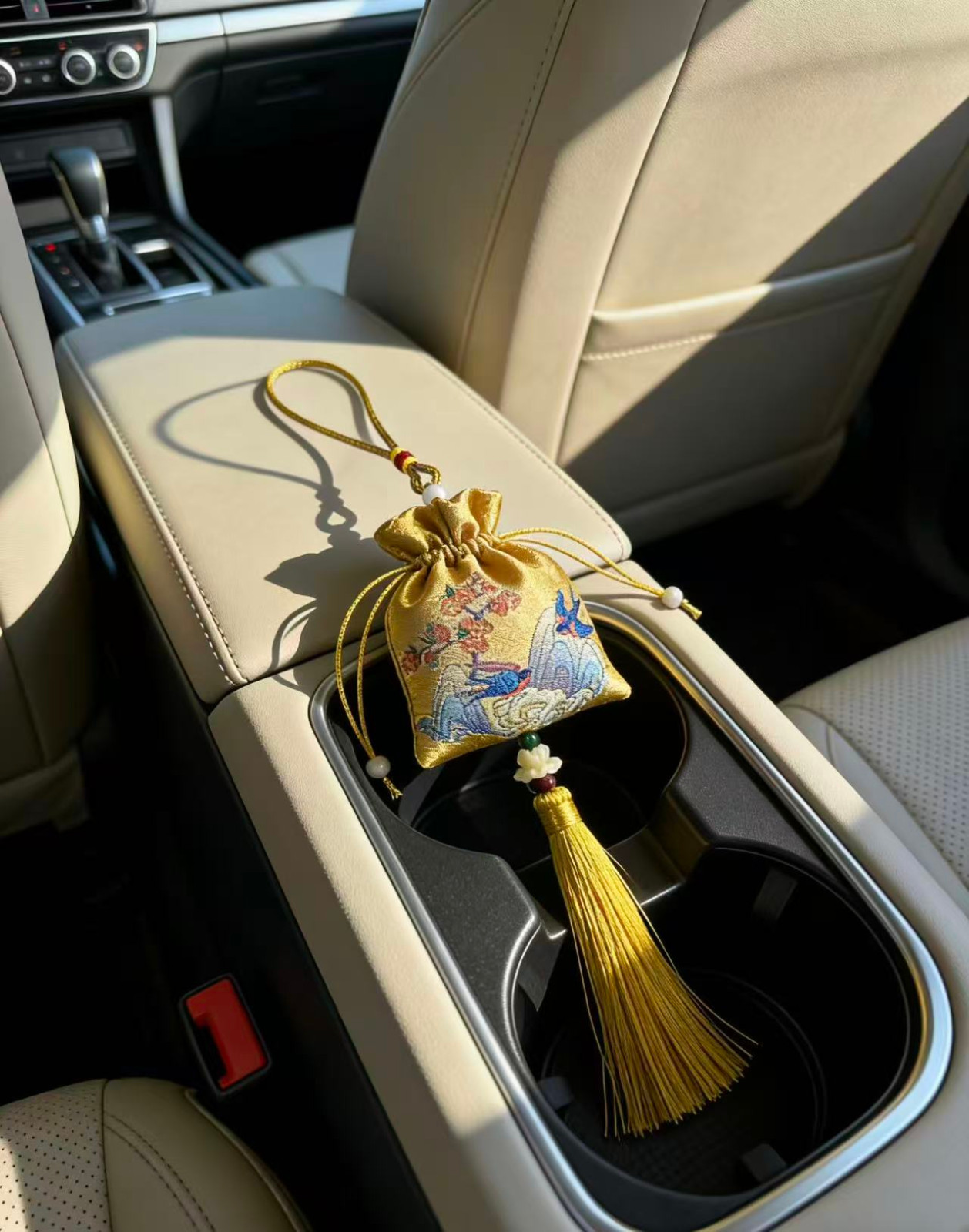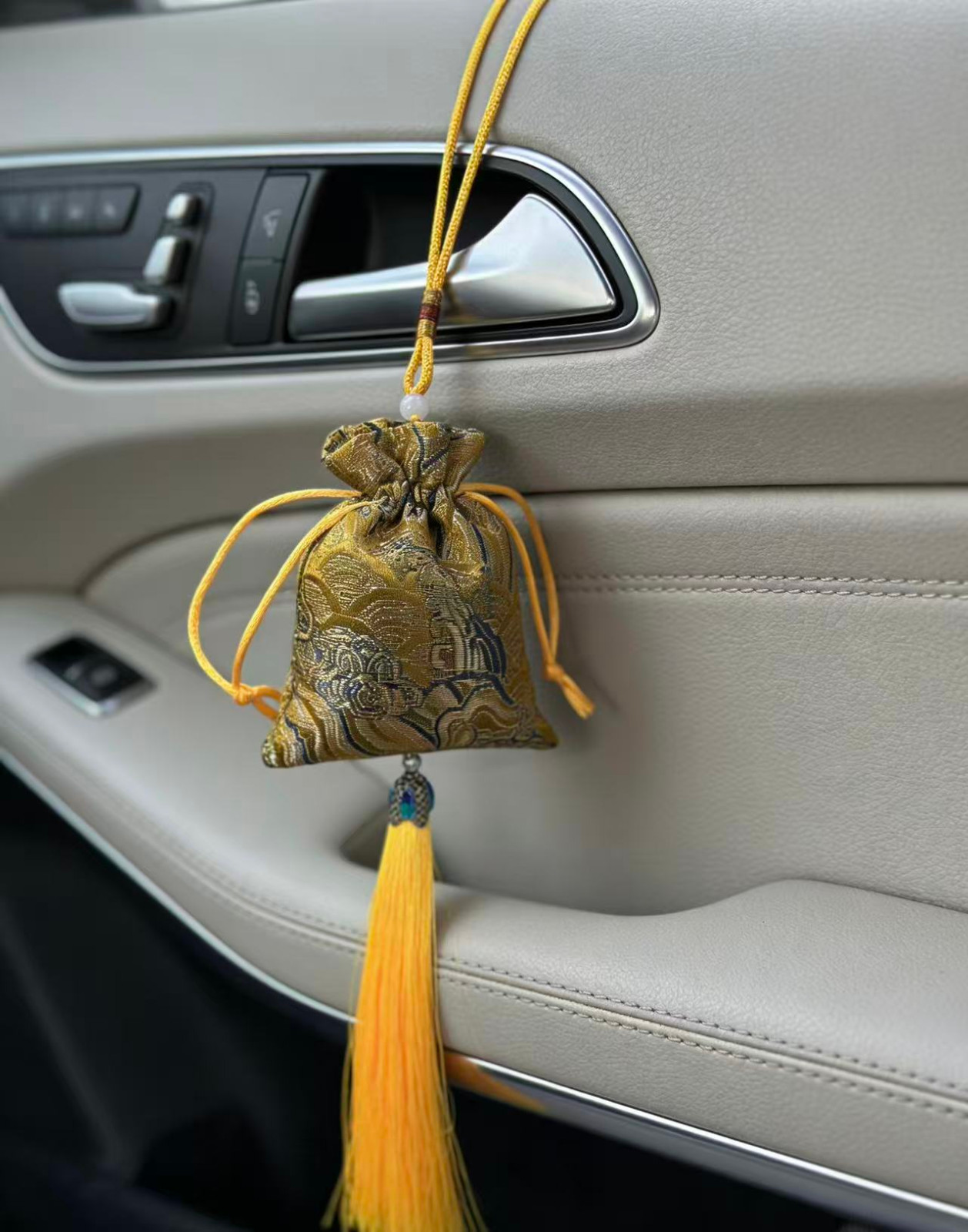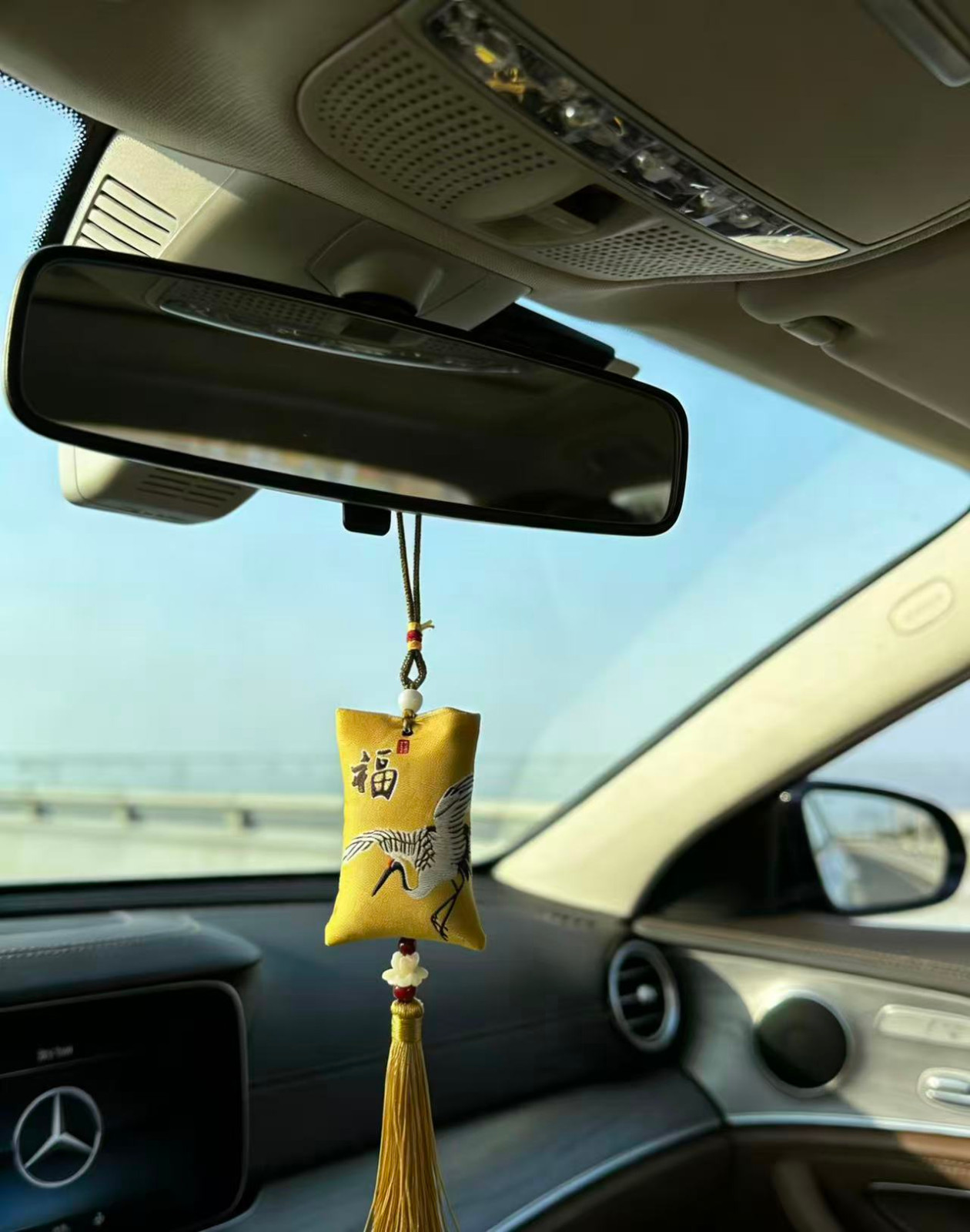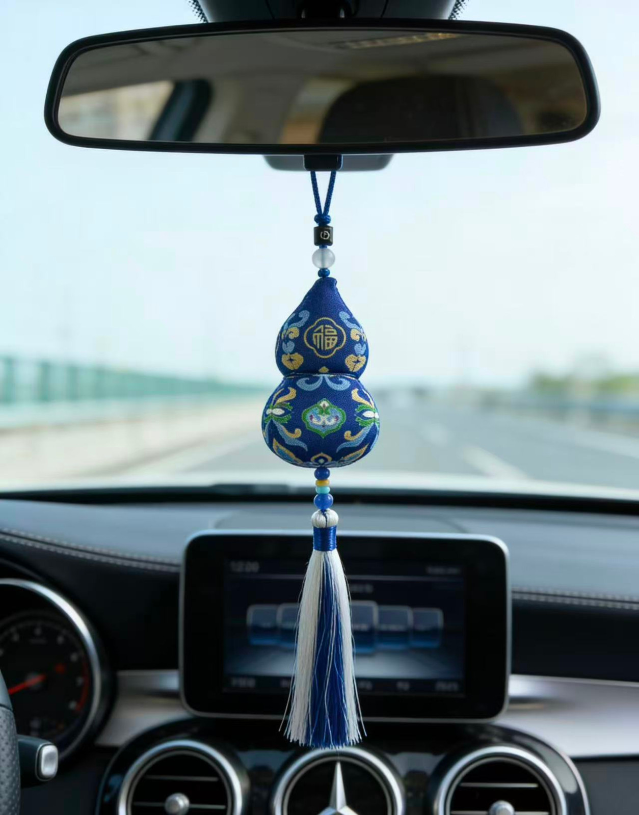 传统刺绣/织锦工艺,五福、喜乐、福鹤等吉祥纹样,挂后视镜不挡视线,美观又实用。