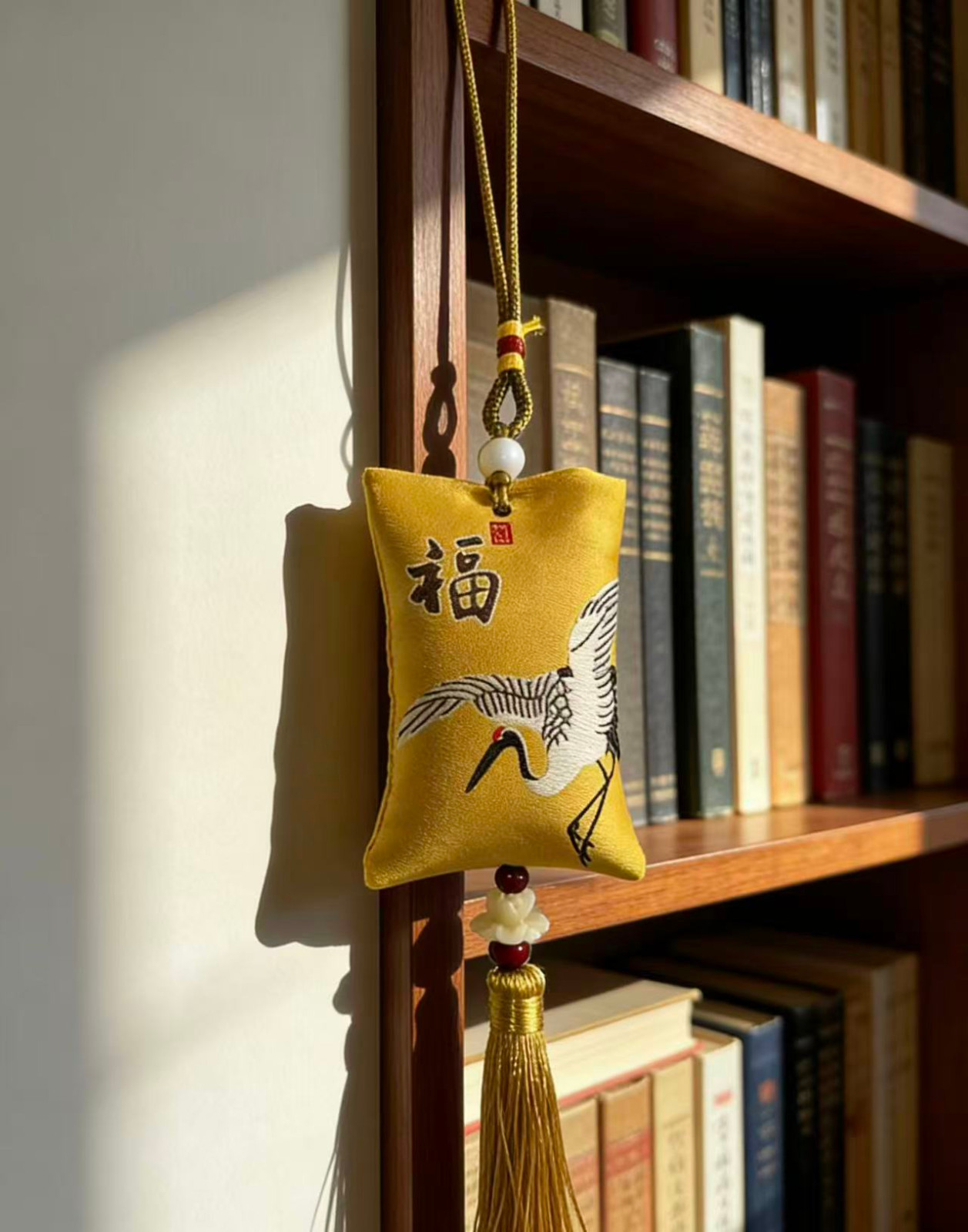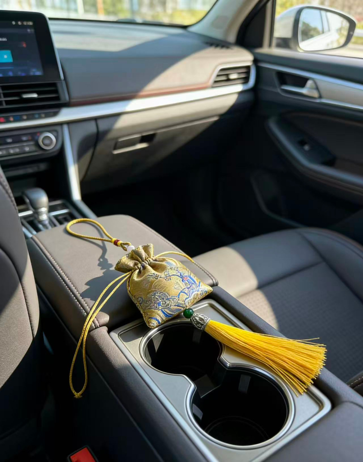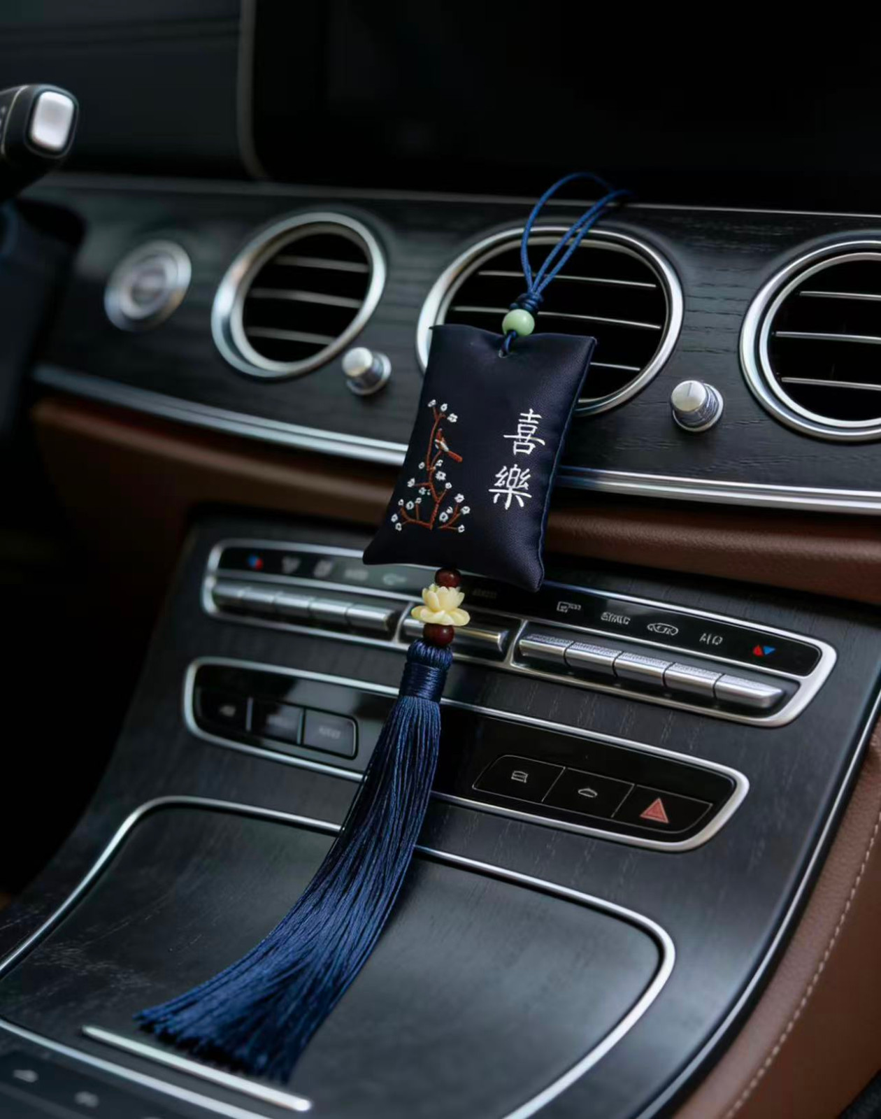 传统刺绣/织锦工艺,五福、喜乐、福鹤等吉祥纹样,挂后视镜不挡视线,美观又实用。