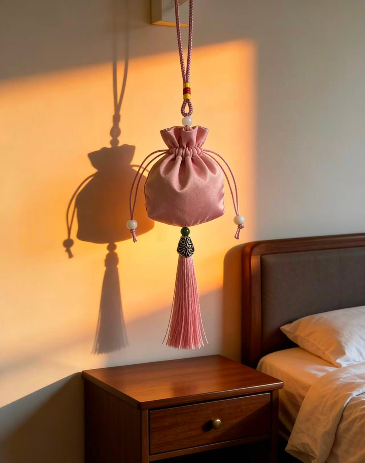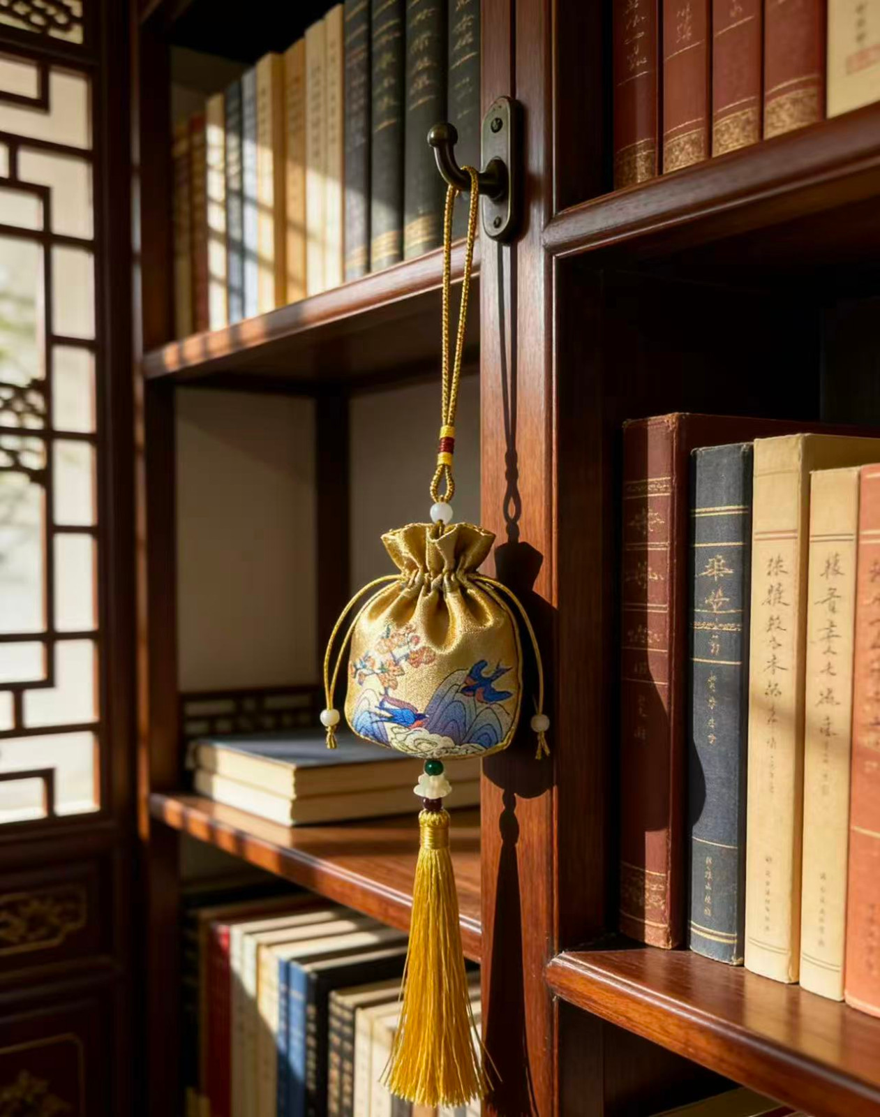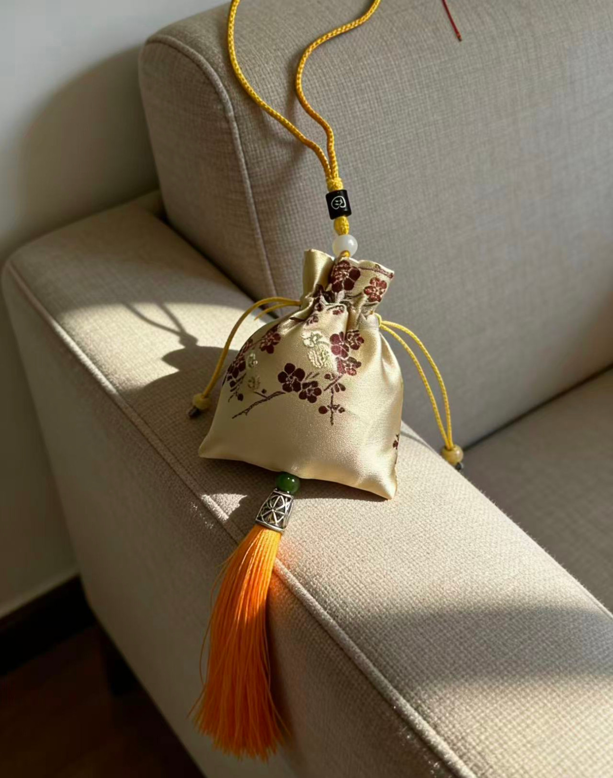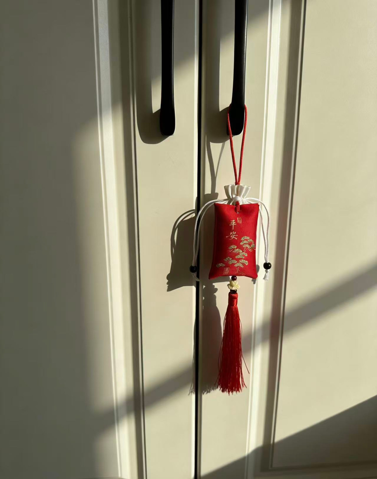 传统刺绣/织锦工艺,五福、喜乐、福鹤等吉祥纹样,挂后视镜不挡视线,美观又实用。